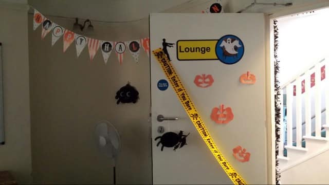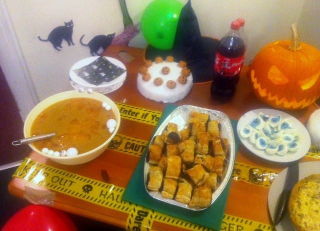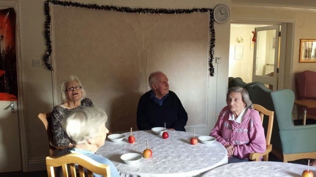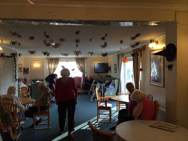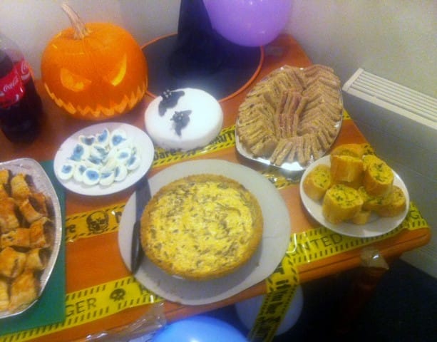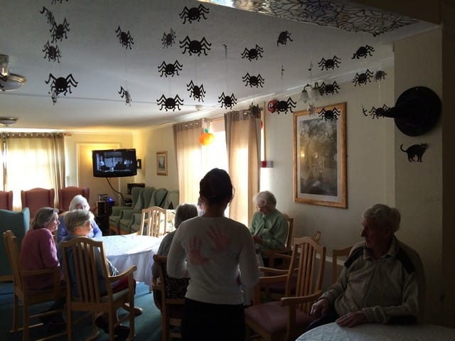 On Friday we had our Halloween party for the residents. Emmy dressed up Morticia Adams and decorated chocolate apples with the residents (photos to follow in another post). Our Chef Morgan made a wonderful spread of home cooked food which included sausage rolls with red onion relish, wild mushroom tart with walnut pastry, monster eyes (boiled eggs), two red velvet cakes, and garlic bread. All the items he made were made from scratch in our kitchen. The residents really enjoyed all the decorations, activities and food.