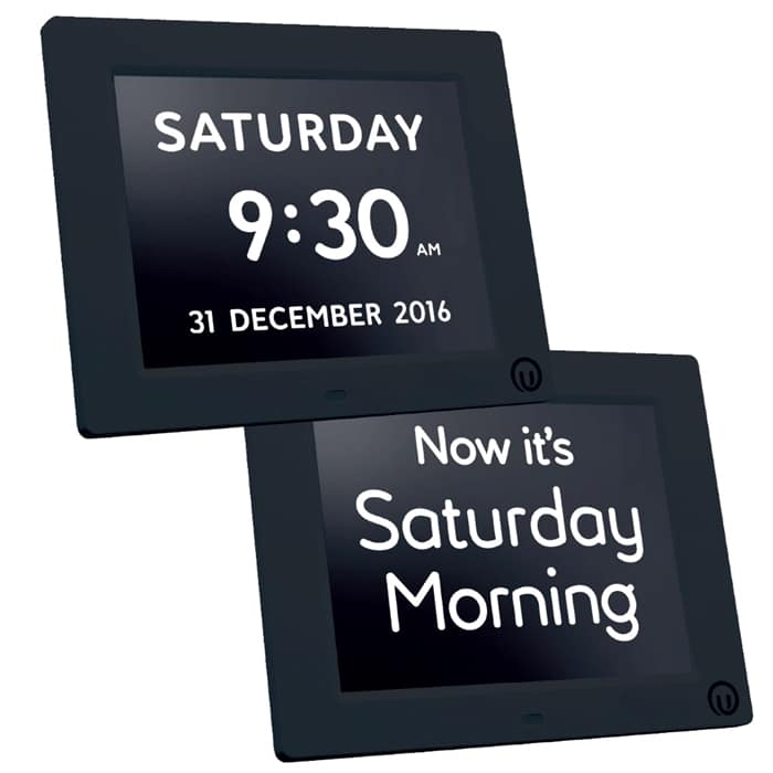 In the initial stages of dementia a clock or watch with a digital display, rather than a traditional clock face, may help. Later, as their symptoms develop, a day clock that simply states the day and what part of the day – morning, afternoon, evening and night – would be more appropriate, as might a talking clock that can also provide verbal reminders.